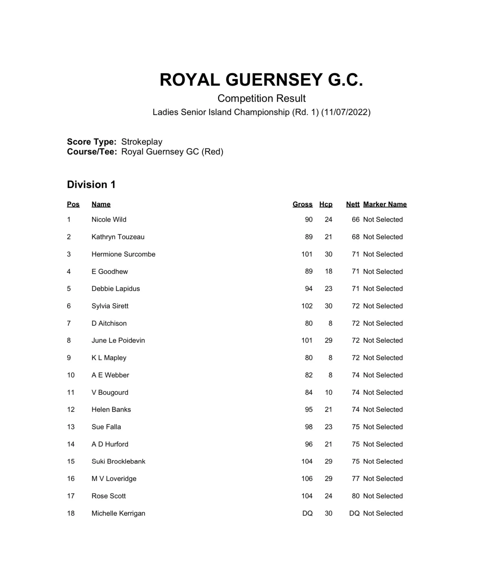 Geoffrey Troop July 11, 2022 Ladies Senior Island Championships 1st Round - Net Scores Geoffrey Troop July 11, 2022