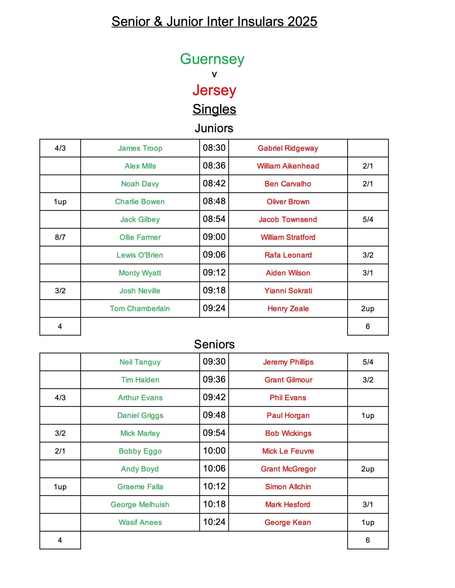 Geoffrey Troop September 7, 2025 Junior and Senior Inter Insular Day 2 results Geoffrey Troop September 7, 2025 Results from today's singles.Jersey win the Senior & Junior Inter-Insulars 9-6 & 8-7 respectively.