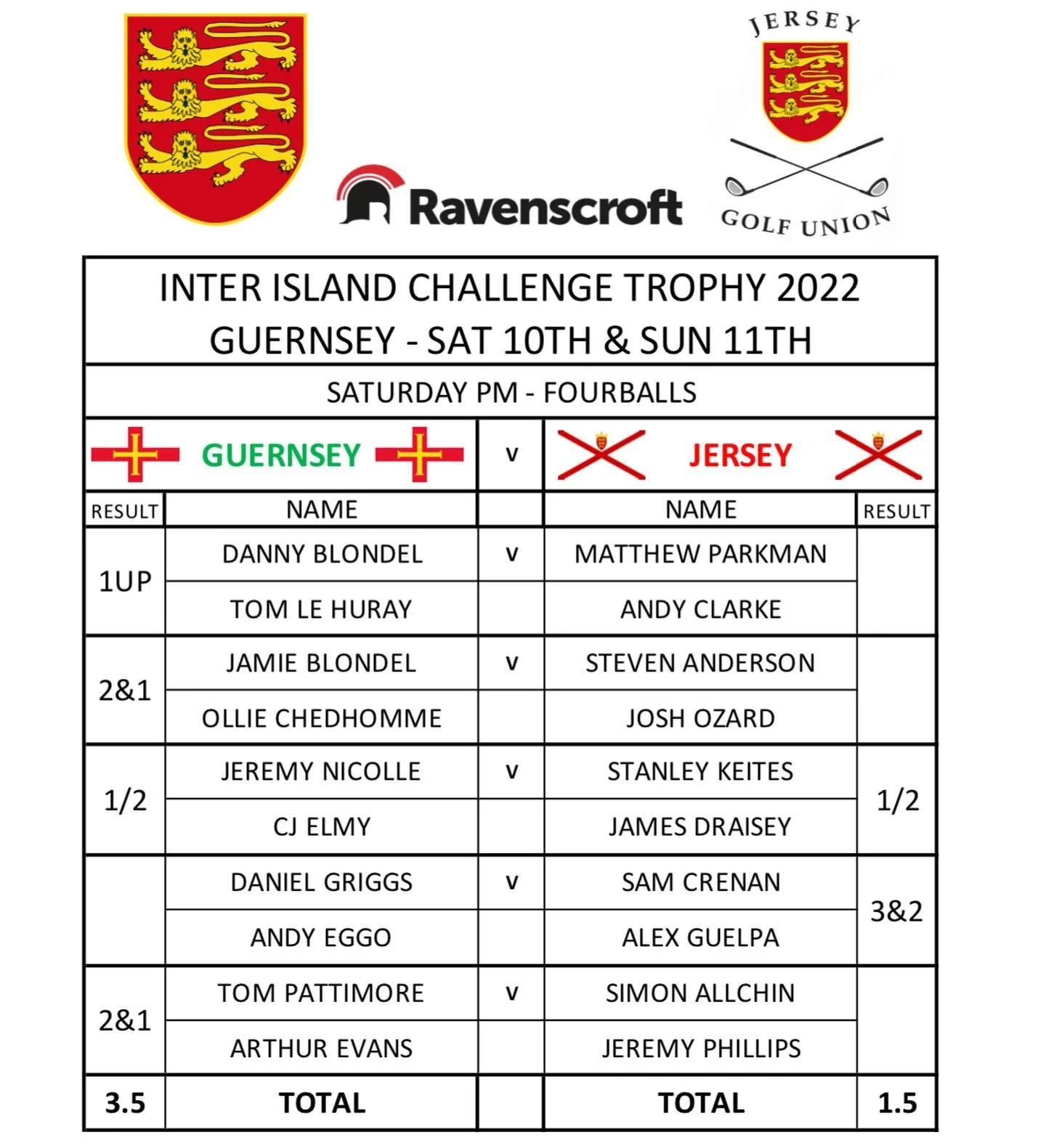 Guernsey got the better of afternoon fourballs to tie the score 5 -5 after Day 1 of the Ravenscroft Men's Inter-Insular against Jersey at L'Ancresse. Ten points are still to play for in tomorrow’s singles.